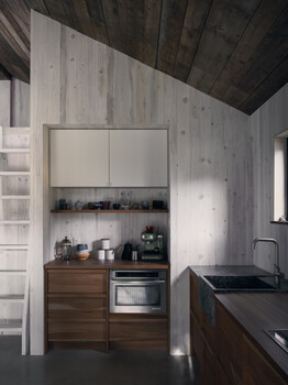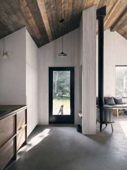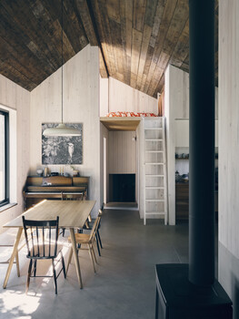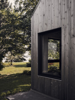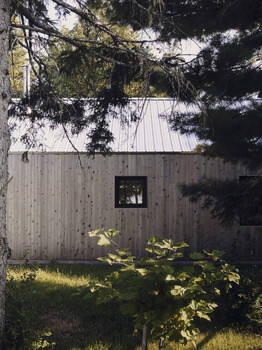 In terms of construction, local wood was favoured because it acts as a carbon sink. It can be found in the structural framing, built-in furniture, and interior finishes in white pine and exterior finishes in cedar. Reused local furniture and materials were also featured in various parts of the project, such as the ceiling, whose boards came from a 125-year-old barn located nearby. In addition to wood, we favoured the use of recycled or renewable materials, such as hemp insulation and recycled wood fiber panels. The increased amount of insulation reduces energy consumption, most of which comes from a photovoltaic system that was planned with the expansion and optimized for the site and the view of the river.
