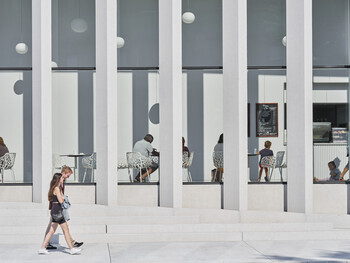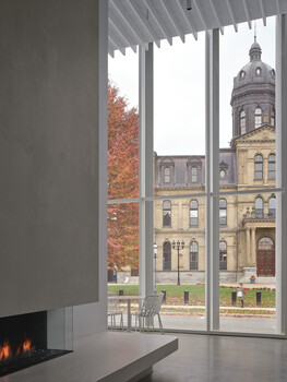 The planning concept centres on a promenade of steps and ramps that rises gently from Queen Street, improving accessibility by bridging the city and elevated galleries. Sited between the Saint John/Wolastoq River and Queen Street, the concave façade mirrors the parallel curves of the river and main street and embraces the city. A colonnade doubles as a brise soleil, blurring inside and outside while inviting all to enter.