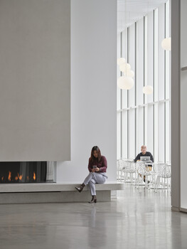 The Pavilion is an efficient, multi-functional space open to all free of charge. It houses rotating art exhibitions, community events, reception and ticketing, a café, fireplace seating, and a shop. Full-height glazing, wide steps, and barrier-free ramps ensure accessibility and intuitive wayfinding. The resulting space fulfills program requirements, while also functioning as an “urban living room”. Its strong relationship to site and community has made it a cherished hub for Indigenous peoples, long-time residents, and newcomers alike.